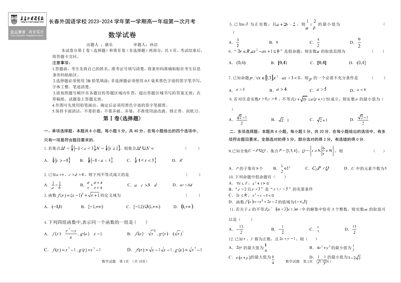 吉林省长春市朝阳区长春外国语学校2023-2024学年高一上学期9月月考数学+答案