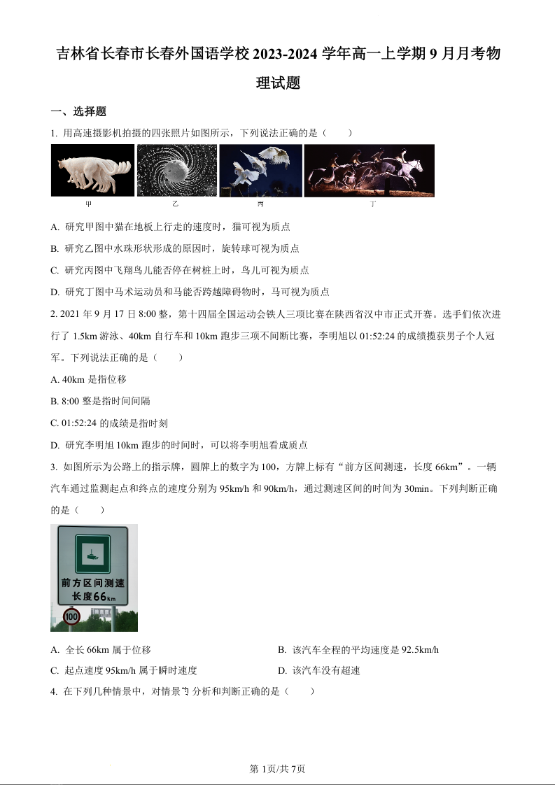 吉林省长春市朝阳区长春外国语学校2023-2024学年高一上学期9月月考物理(原卷版)