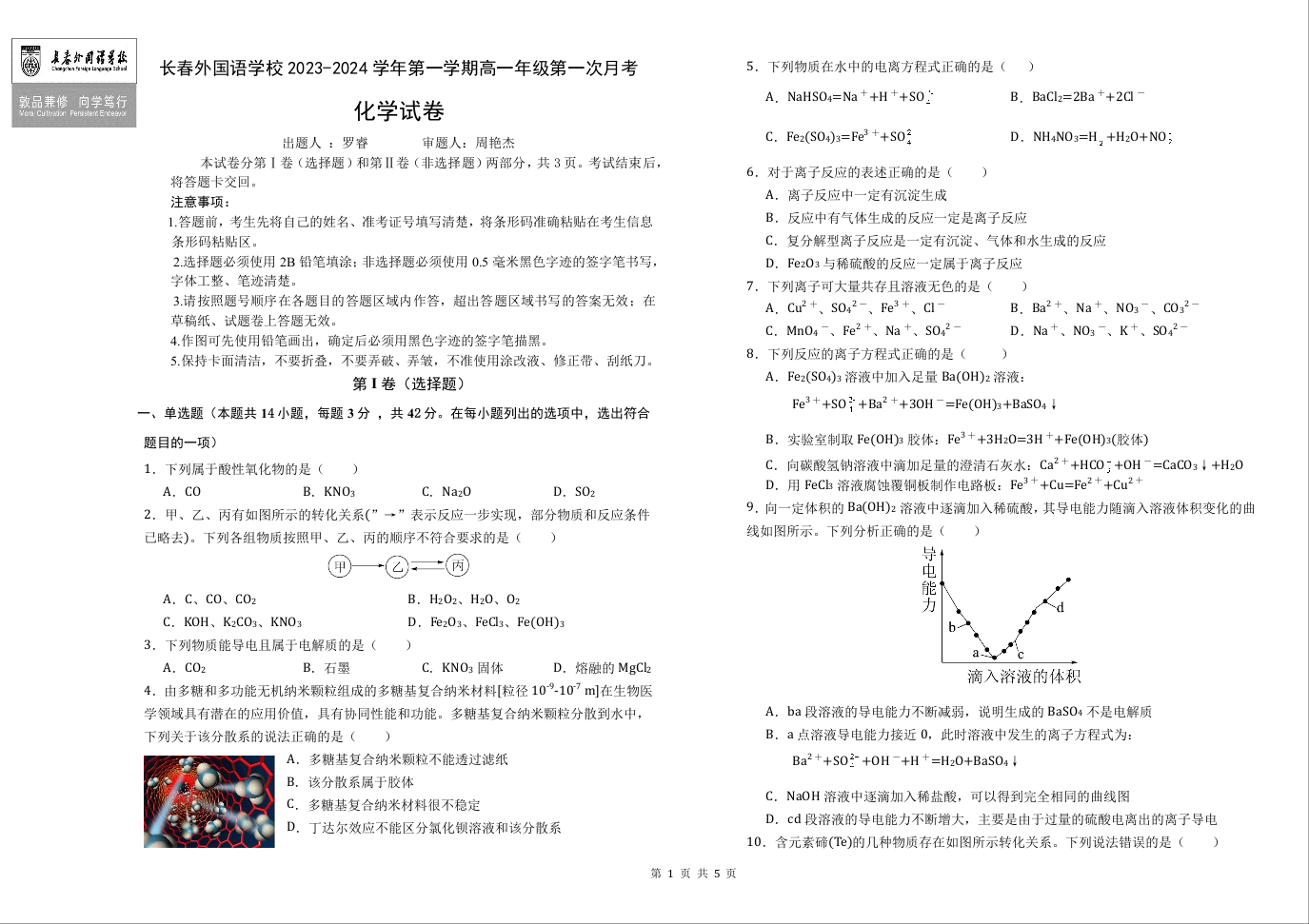 吉林省长春市朝阳区长春外国语学校2023-2024学年高一上学期9月月考化学+答案