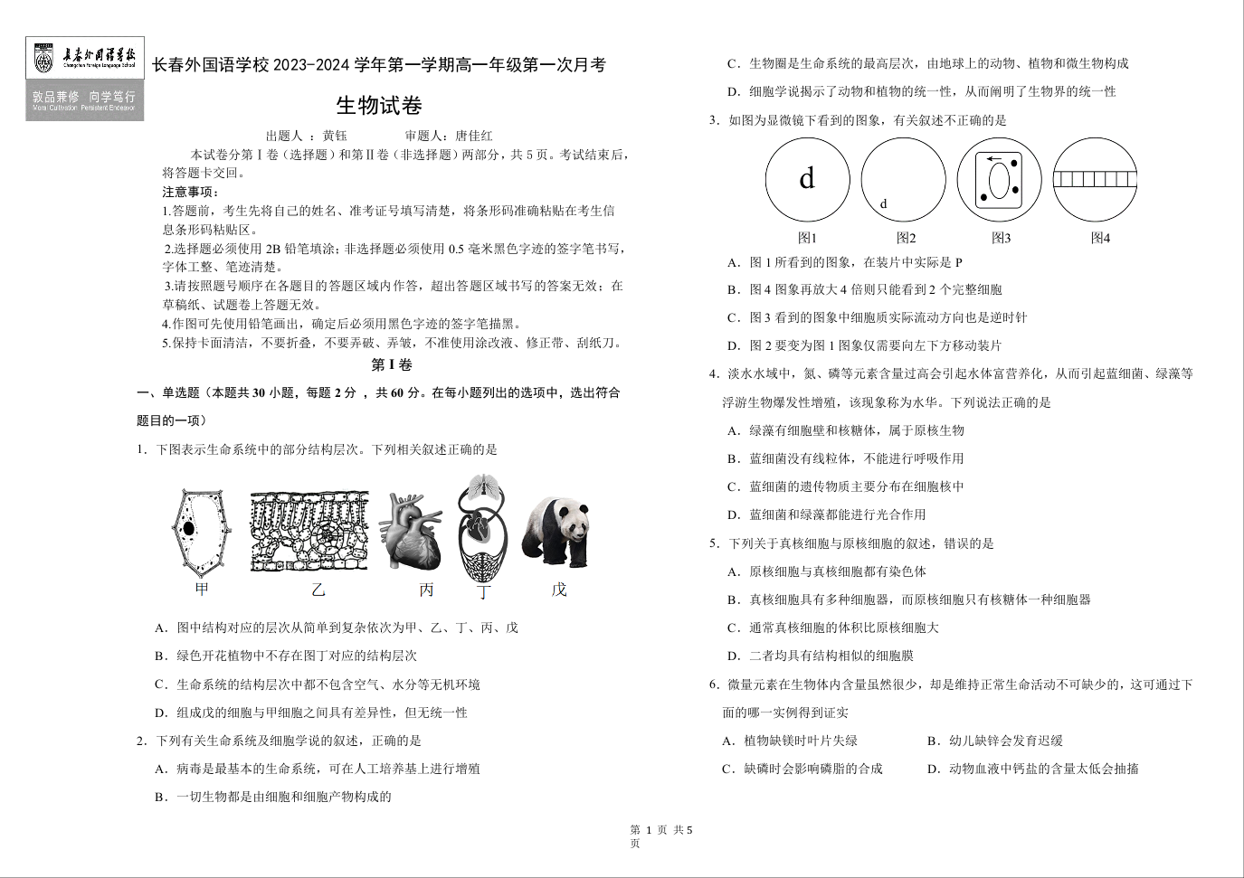 吉林省长春市朝阳区长春外国语学校2023-2024学年高一上学期9月月考生物+答案