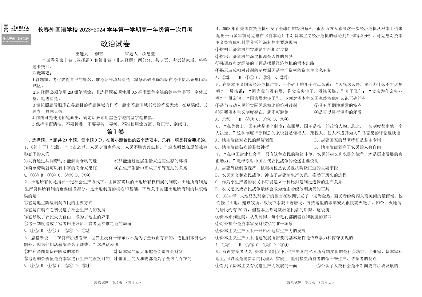 吉林省长春市朝阳区长春外国语学校2023-2024学年高一上学期9月月考政治+答案
