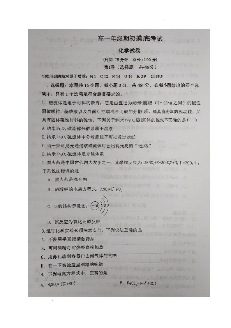 江苏省连云港市灌云县南京师范大学灌云附属中学2023-2024学年高一上学期期初摸底考试化学