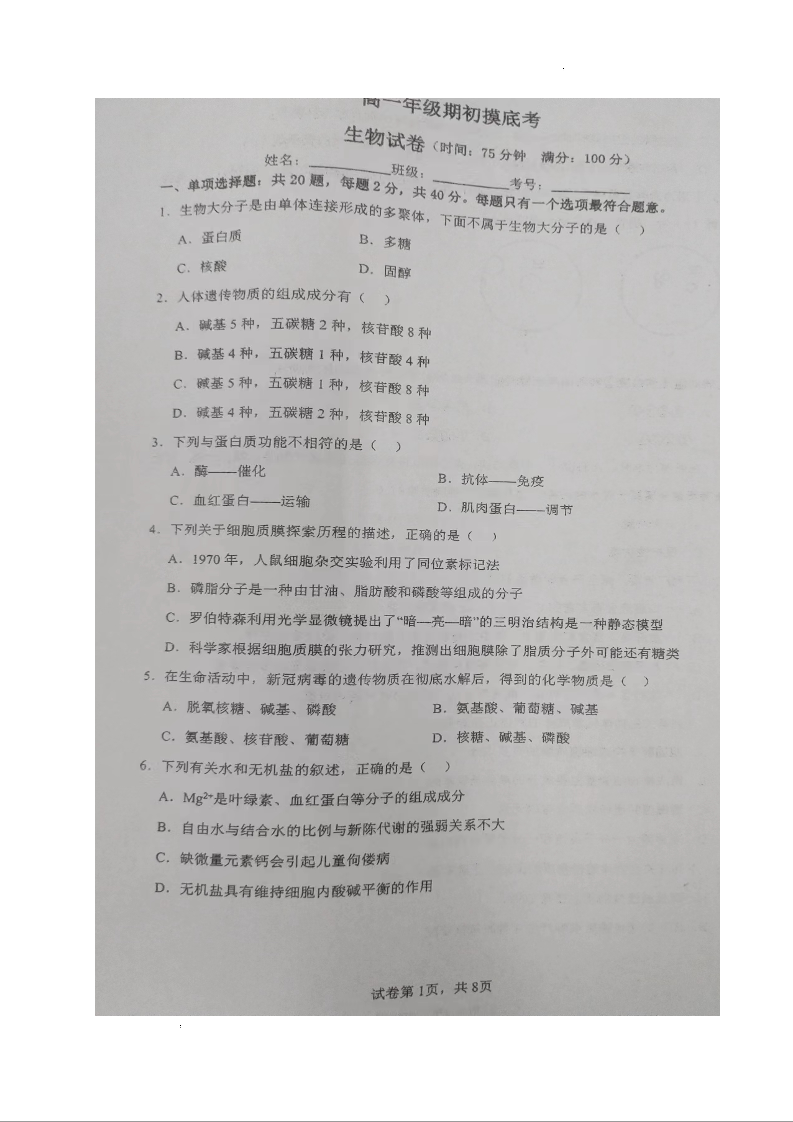 江苏省连云港市灌云县南京师范大学灌云附属中学2023-2024学年高一上学期期初摸底考试生物