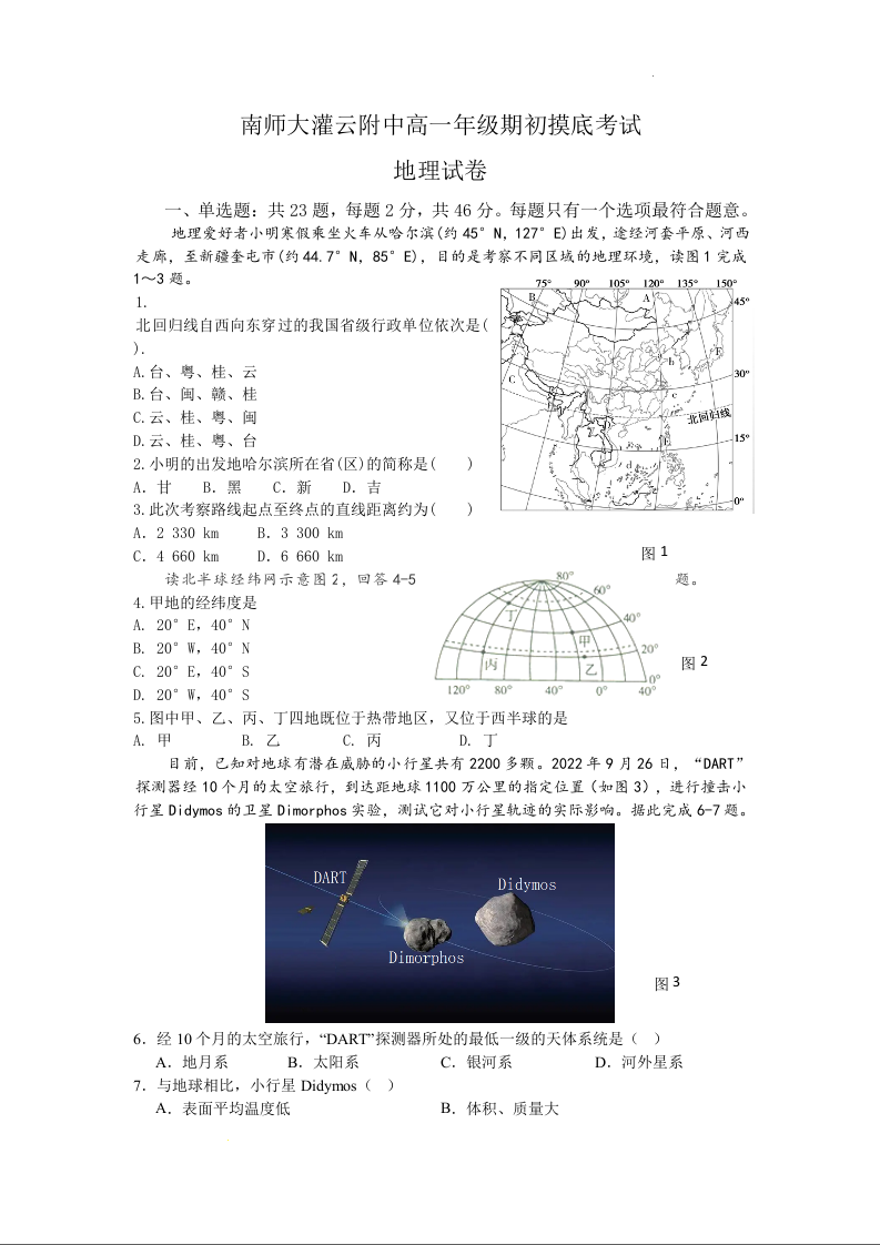 江苏省连云港市灌云县南京师范大学灌云附属中学2023-2024学年高一上学期期初摸底考试地理