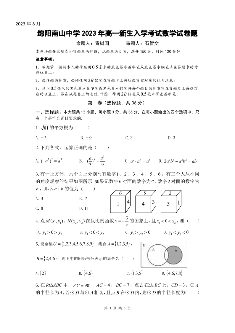 四川省绵阳市南山中学2023-2024学年高一上学期开学考数学+答案