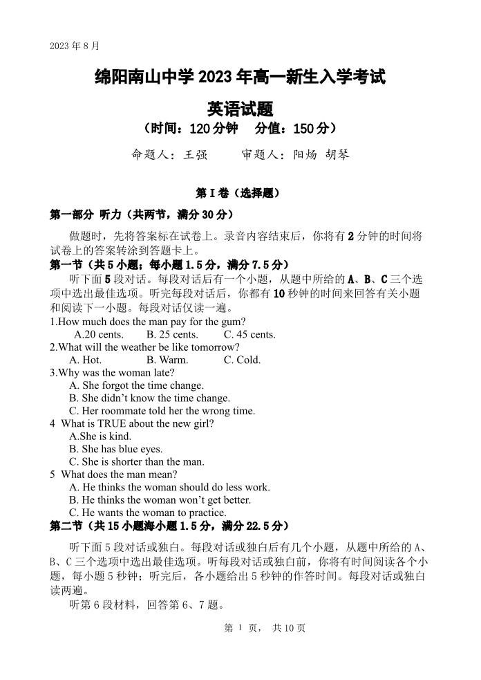 四川省绵阳市南山中学2023-2024学年高一上学期开学考英语+答案