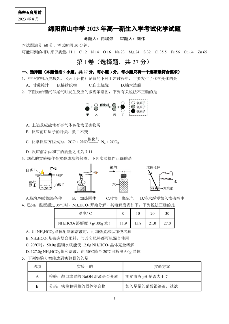 四川省绵阳市南山中学2023-2024学年高一上学期开学考化学+答案
