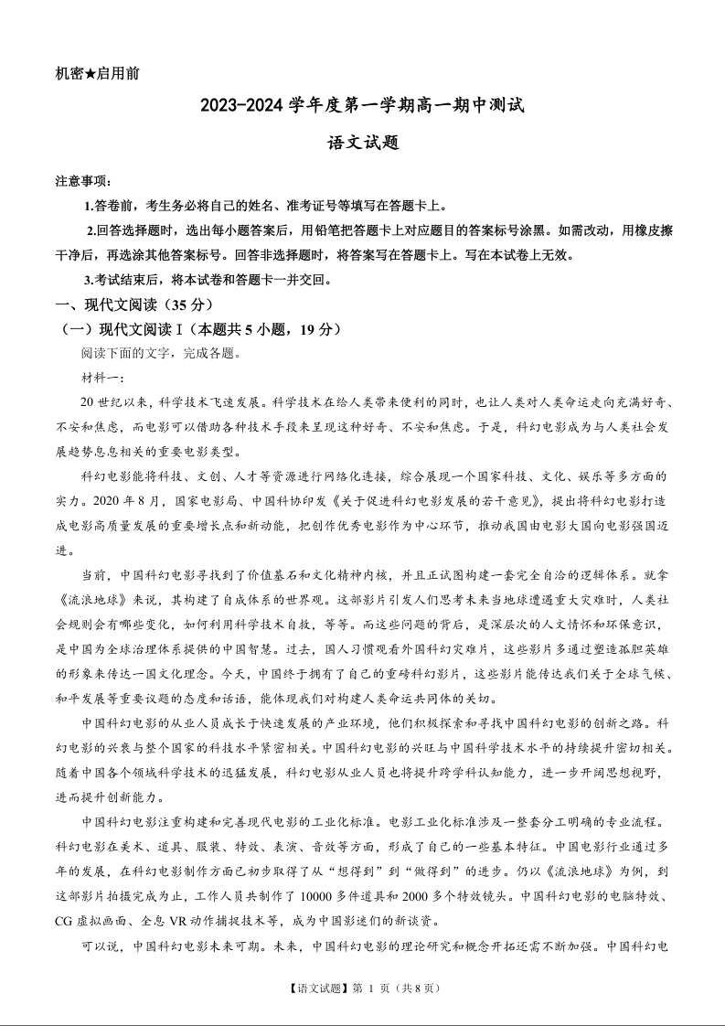 广东省阳江市2023-2024学年高一上学期10月期中考试语文+答案