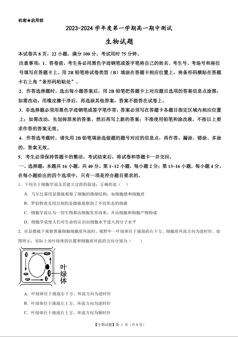 广东省阳江市2023-2024学年高一上学期10月期中考试生物+答案