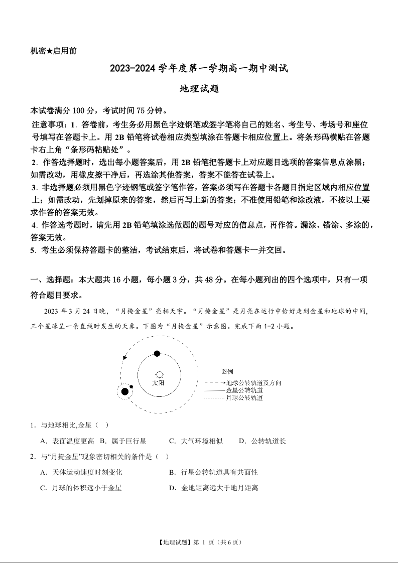 广东省阳江市2023-2024学年高一上学期10月期中考试地理+答案