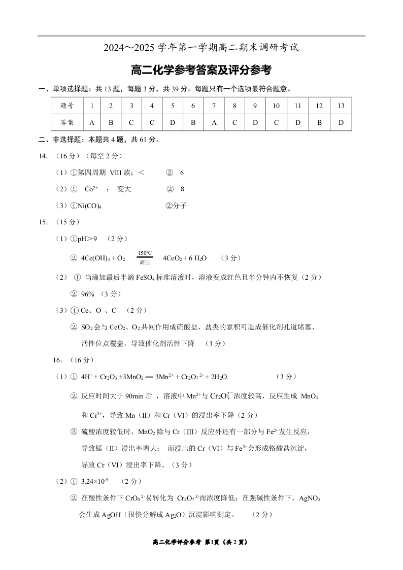 江苏省连云港市2024-2025学年上学期1月高二期末考试化学答案