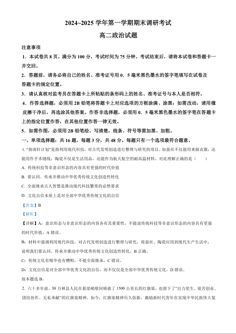 江苏省连云港市2024-2025学年上学期1月高二期末考试政治(解析版)