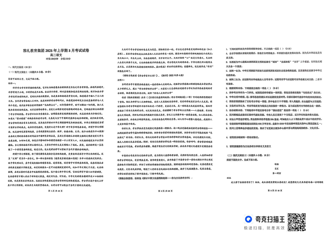 湖南省长沙市雅礼集团2024-2025学年下学期3月高二月考语文