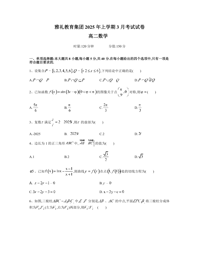 湖南省长沙市雅礼集团2024-2025学年下学期3月高二月考数学 (原卷版)