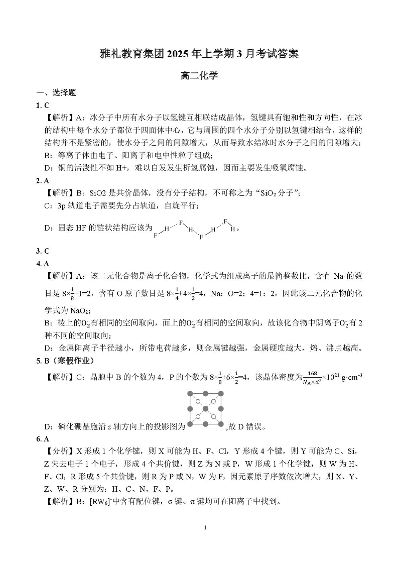 湖南省长沙市雅礼集团2024-2025学年下学期3月高二月考化学答案