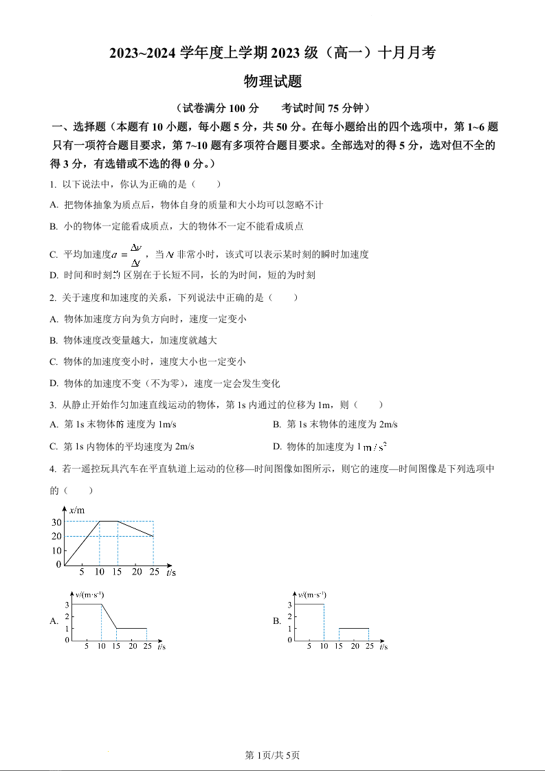 广西柳州高级中学2023-2024学年高一上学期10月月考物理(原卷版)