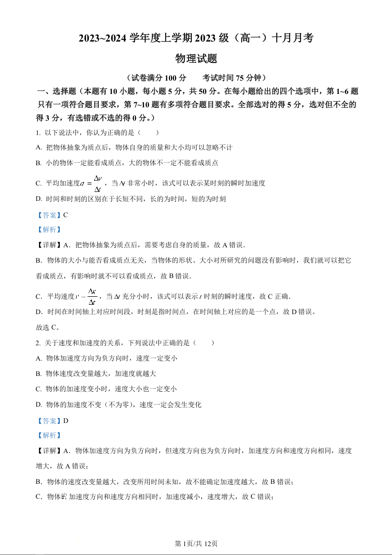 广西柳州高级中学2023-2024学年高一上学期10月月考物理(精品解析版)