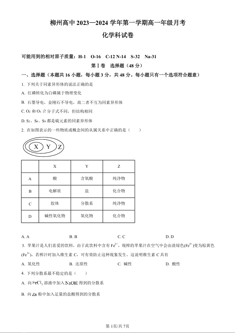 广西柳州高级中学2023-2024学年高一上学期10月月考化学(原卷版)