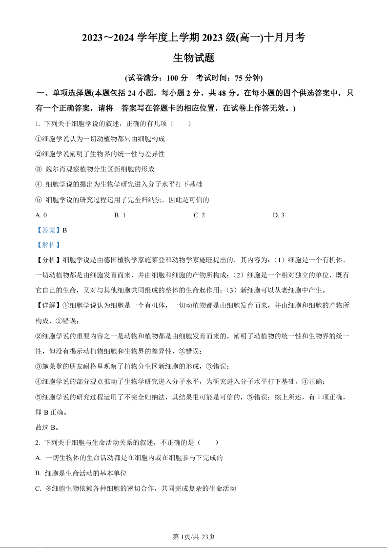 广西柳州高级中学2023-2024学年高一上学期10月月考生物(精品解析版)