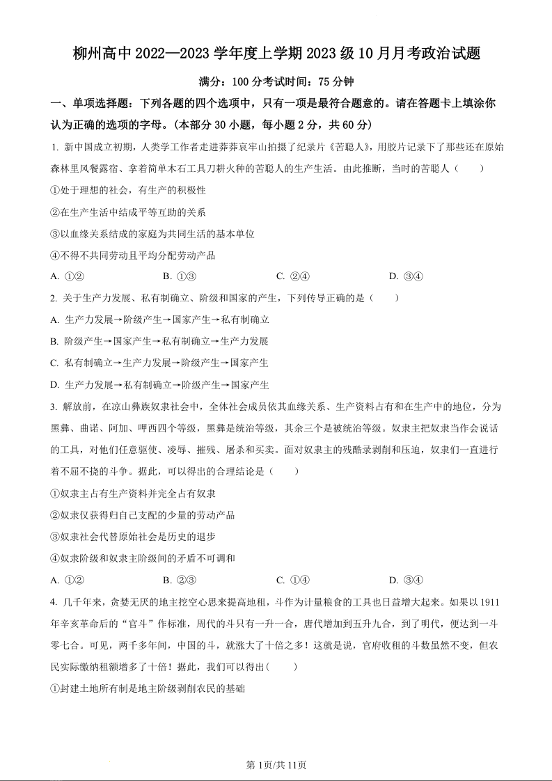 广西柳州高级中学2023-2024学年高一上学期10月月考政治(原卷版)