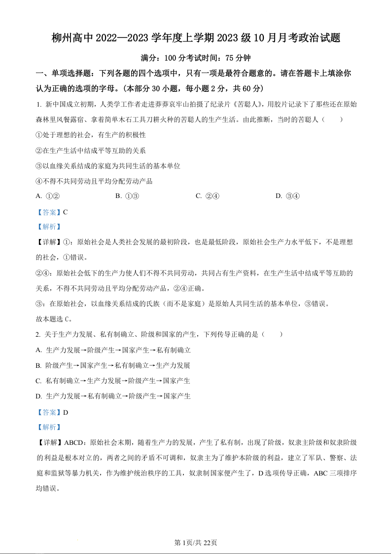 广西柳州高级中学2023-2024学年高一上学期10月月考政治(精品解析版)
