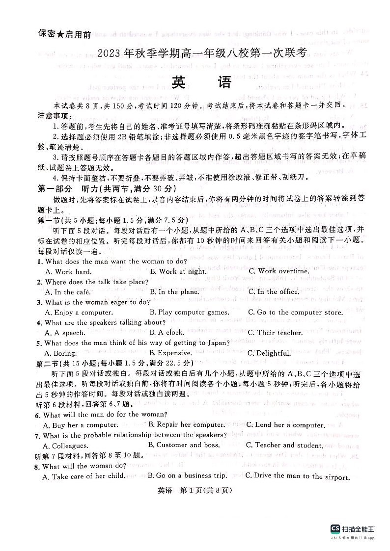 广西壮族自治区河池市八校联考2023-2024学年高一上学期10月月考英语