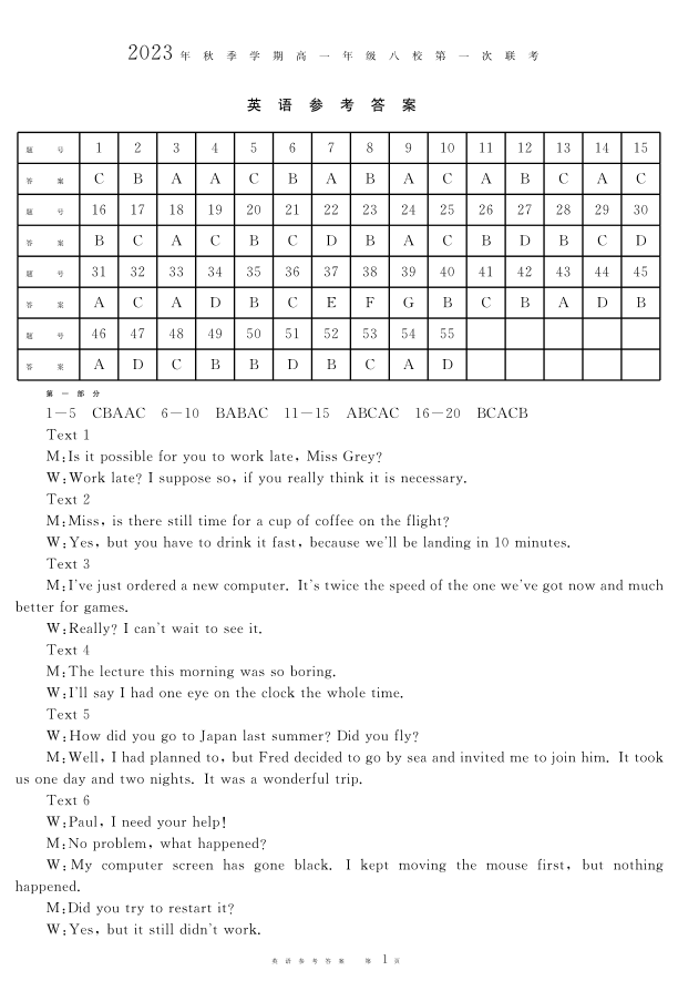 广西壮族自治区河池市八校联考2023-2024学年高一上学期10月月考英语答案