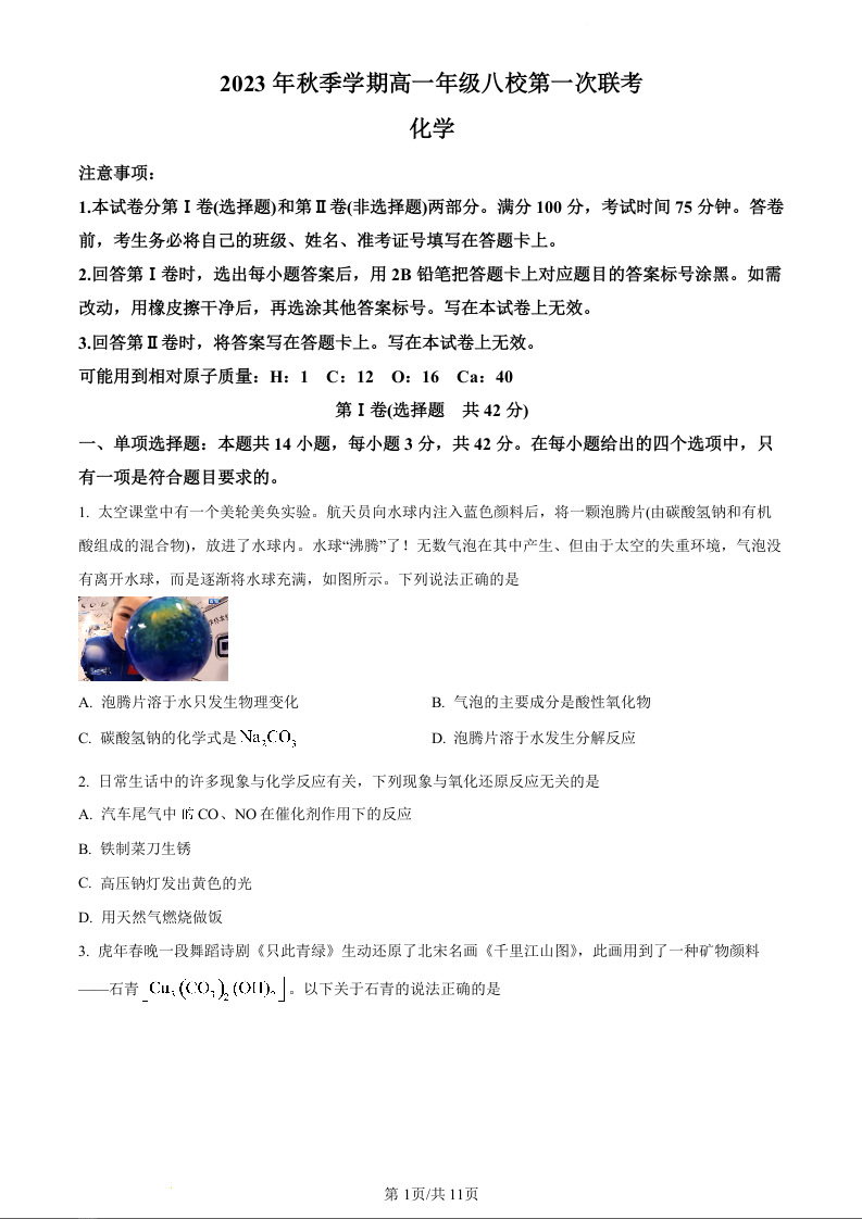 广西壮族自治区河池市八校联考2023-2024学年高一上学期10月月考化学+答案