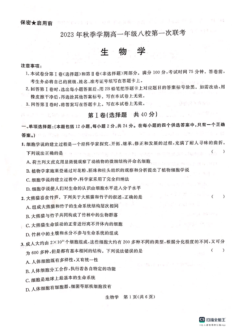 广西壮族自治区河池市八校联考2023-2024学年高一上学期10月月考生物