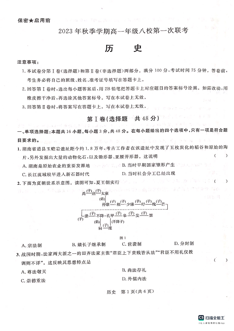 广西壮族自治区河池市八校联考2023-2024学年高一上学期10月月考历史