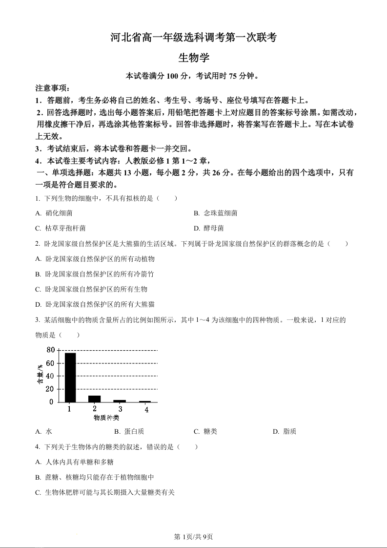 河北省保定市部分高中2023-2024学年高一上学期10月月考生物(原卷版)