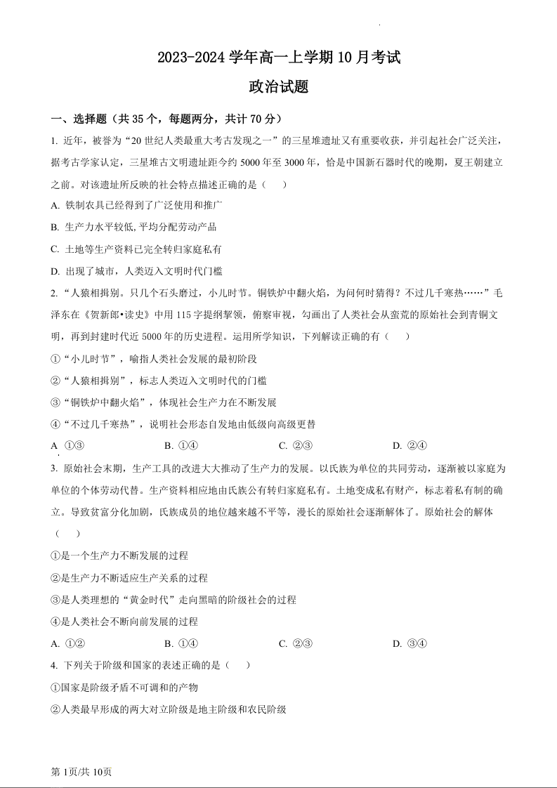 河北省保定市部分高中2023-2024学年高一上学期10月月考政治(原卷版)