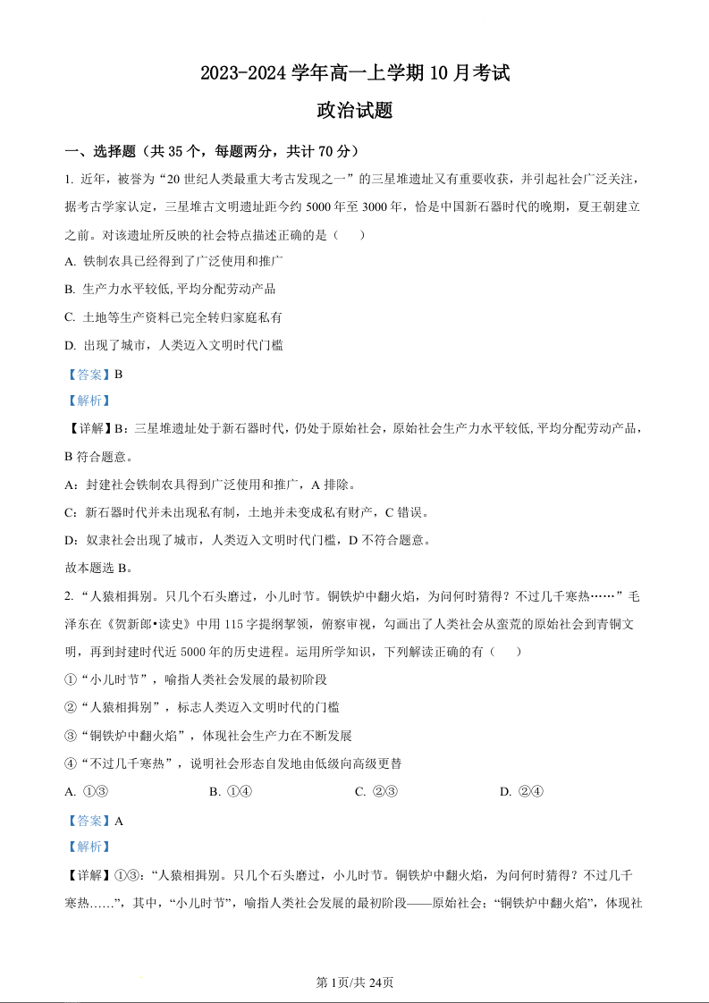 河北省保定市部分高中2023-2024学年高一上学期10月月考政治(精品解析版)