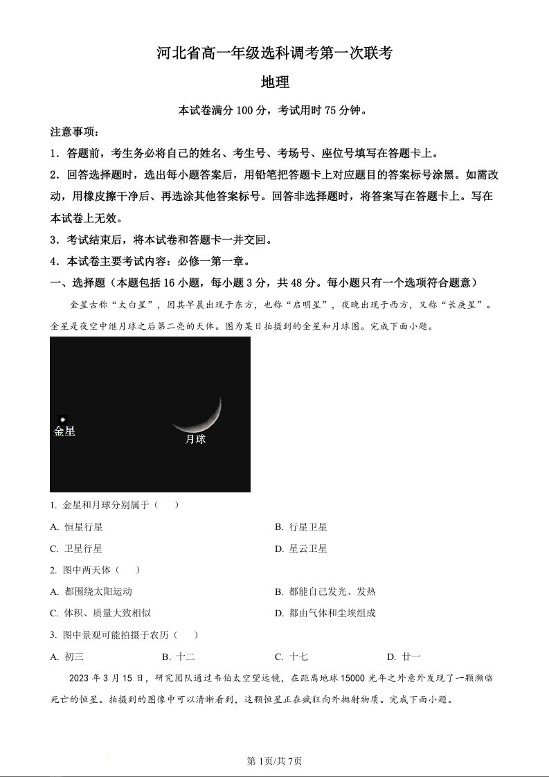 河北省保定市部分高中2023-2024学年高一上学期10月月考地理(原卷版)