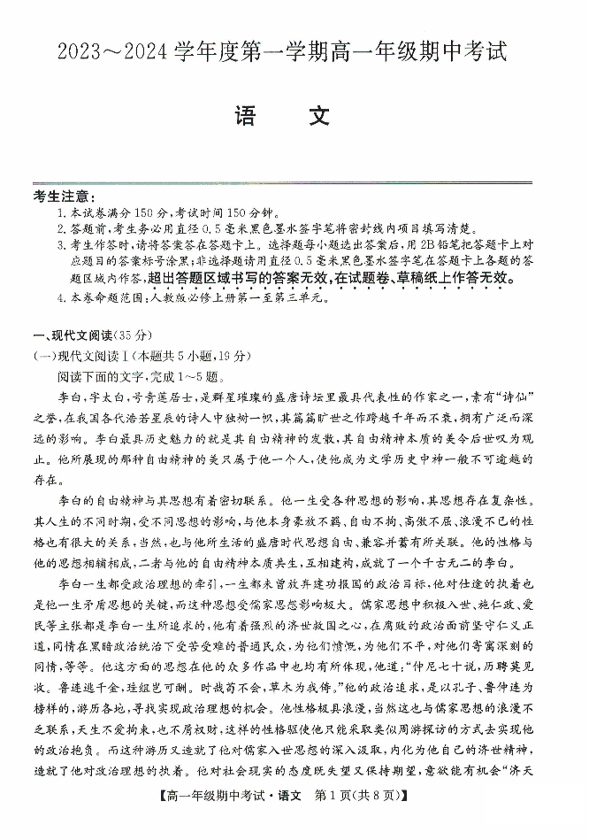 河北省沧州运东七县联考2023-2024学年高一上学期10月期中考试语文