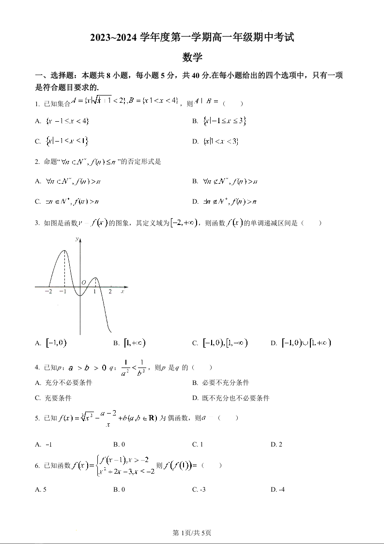 河北省沧州运东七县联考2023-2024学年高一上学期10月期中考试数学(原卷版)