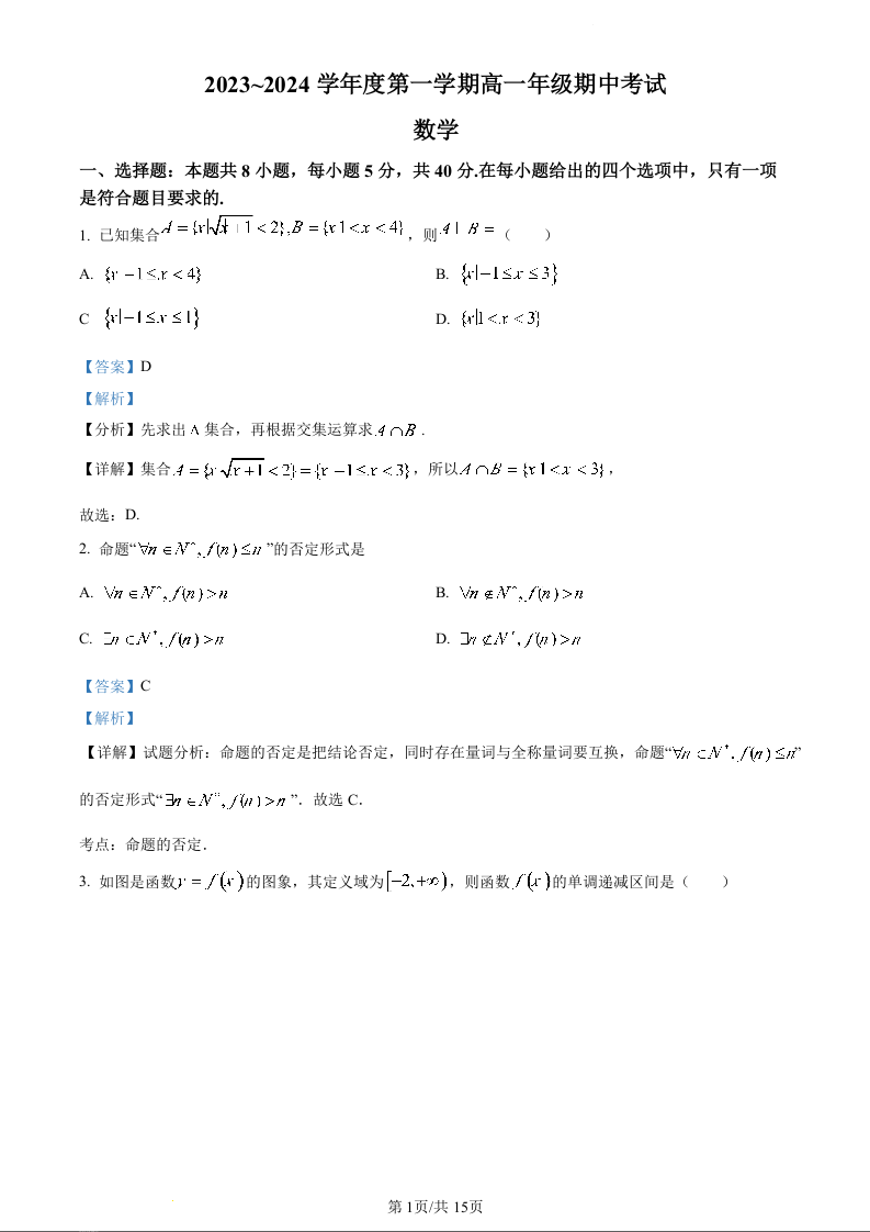 河北省沧州运东七县联考2023-2024学年高一上学期10月期中考试数学(精品解析版)