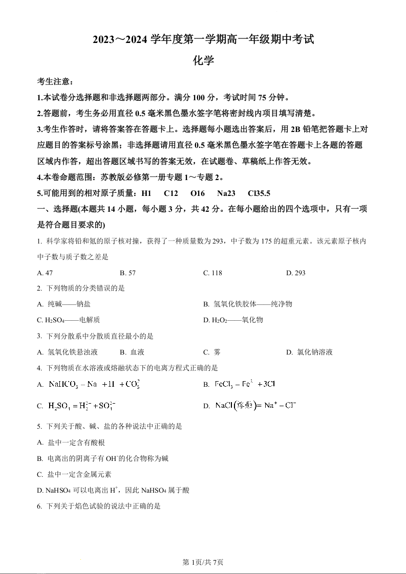 河北省沧州运东七县联考2023-2024学年高一上学期10月期中考试化学(原卷版)