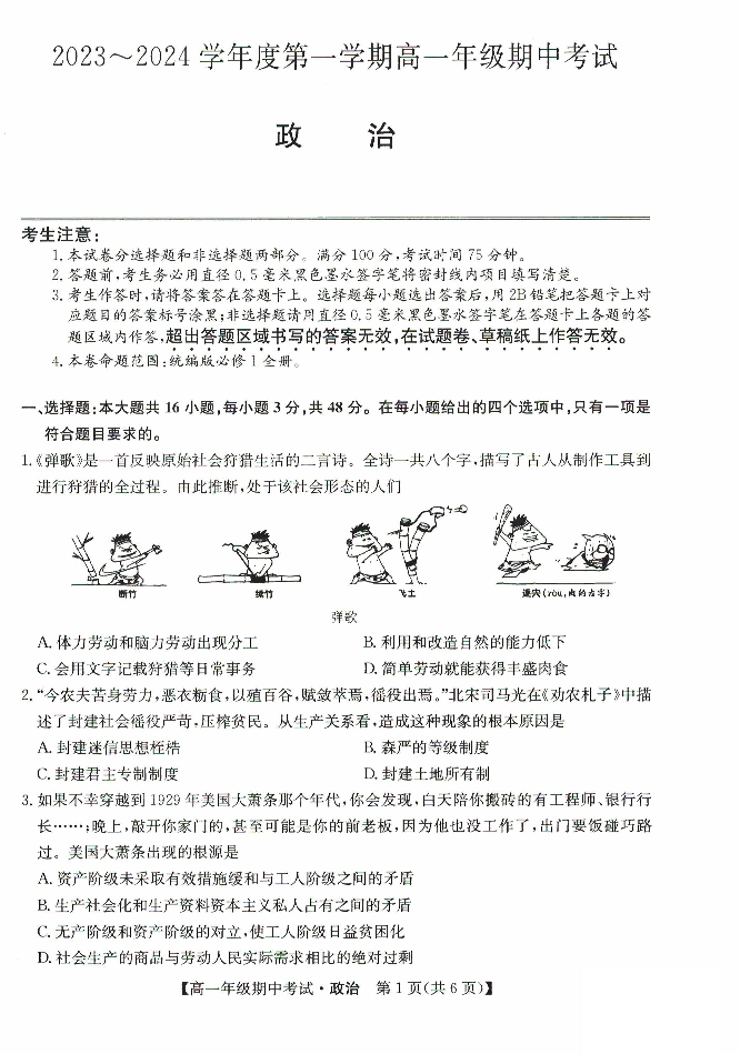 河北省沧州运东七县联考2023-2024学年高一上学期10月期中考试政治