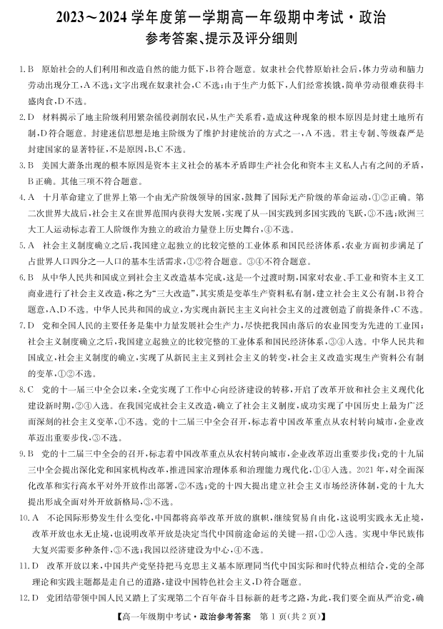 河北省沧州运东七县联考2023-2024学年高一上学期10月期中考试政治答案