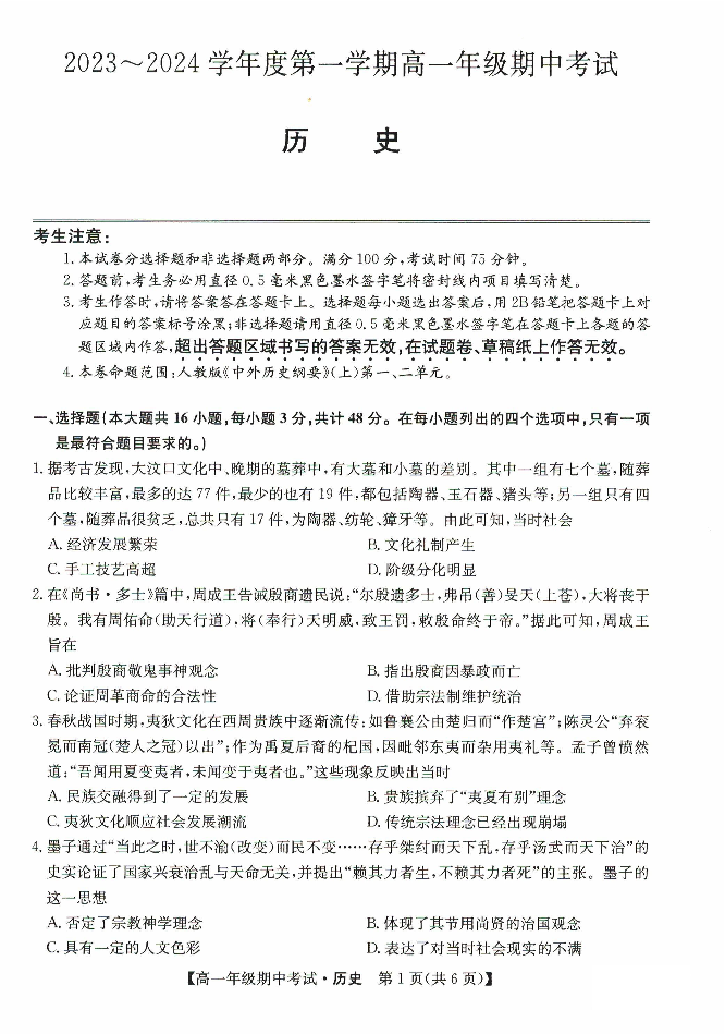 河北省沧州运东七县联考2023-2024学年高一上学期10月期中考试历史