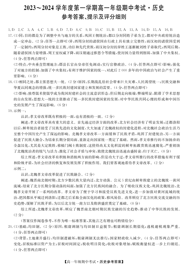 河北省沧州运东七县联考2023-2024学年高一上学期10月期中考试历史答案