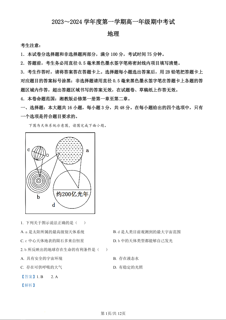 河北省沧州运东七县联考2023-2024学年高一上学期10月期中考试地理(精品解析版)