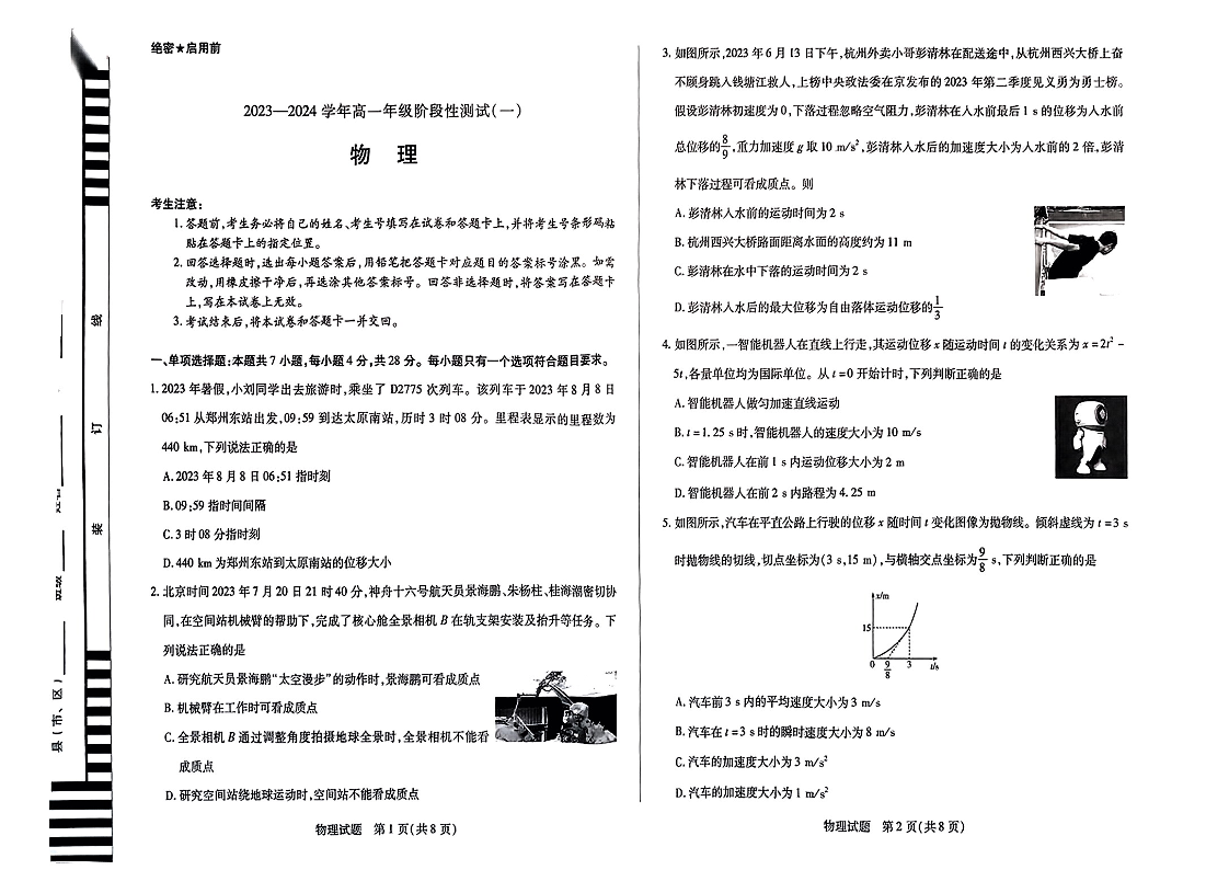 河南省2023-2024学年高一上学期阶段性测试(一)物理