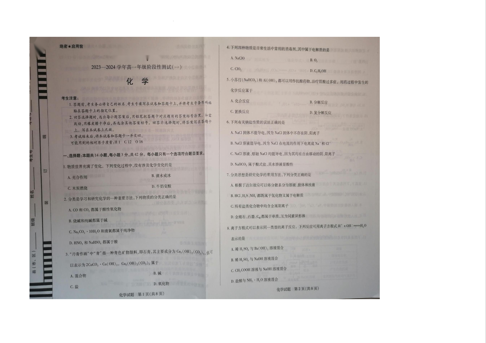 河南省2023-2024学年高一上学期阶段性测试(一)化学