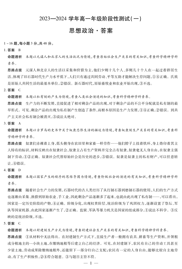 河南省2023-2024学年高一上学期阶段性测试(一)政治答案