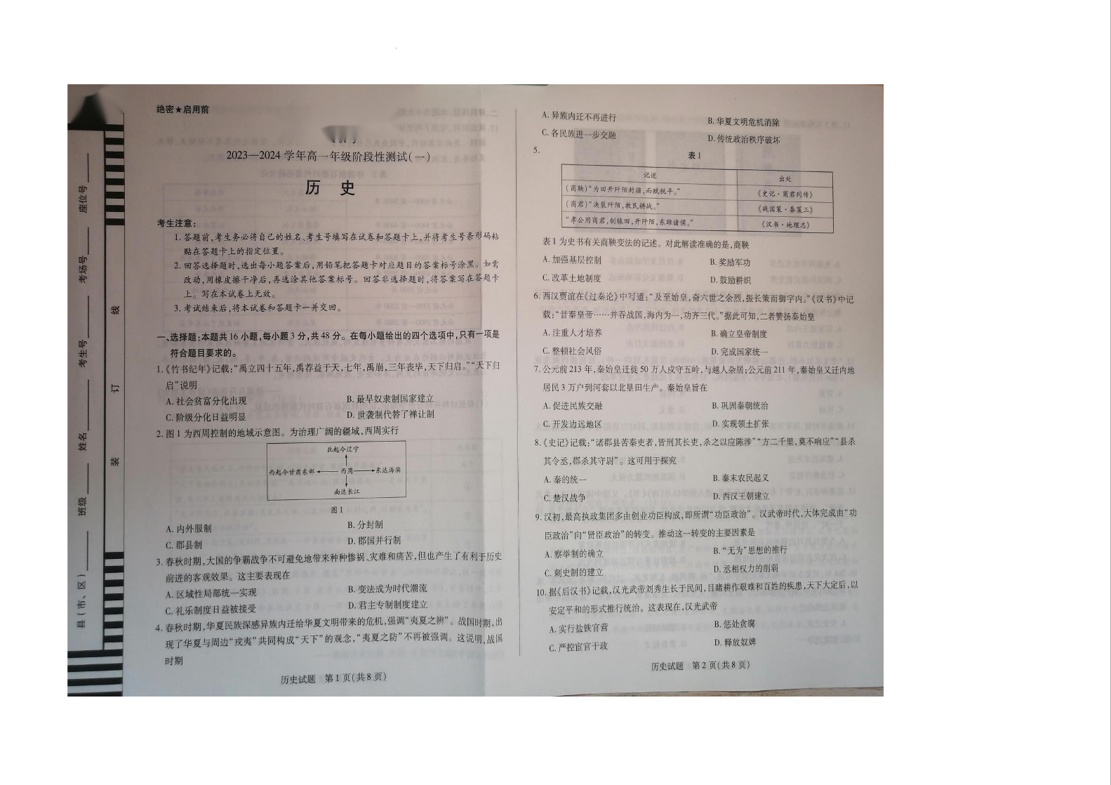 河南省2023-2024学年高一上学期阶段性测试(一)历史