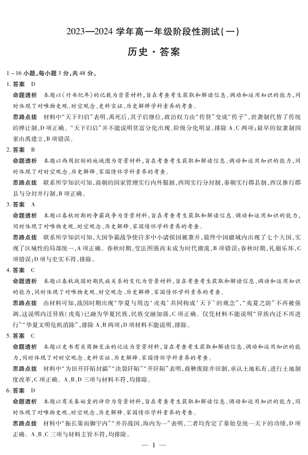 河南省2023-2024学年高一上学期阶段性测试(一)历史答案