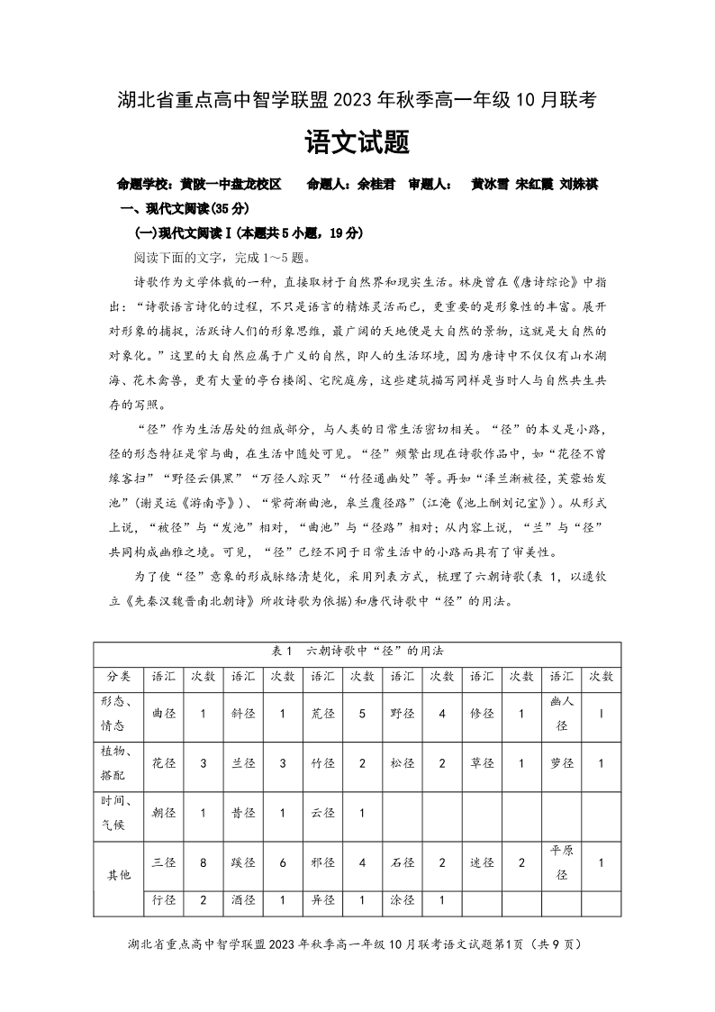 湖北省重点高中智学联盟2023年秋季高一年级10月联考语文