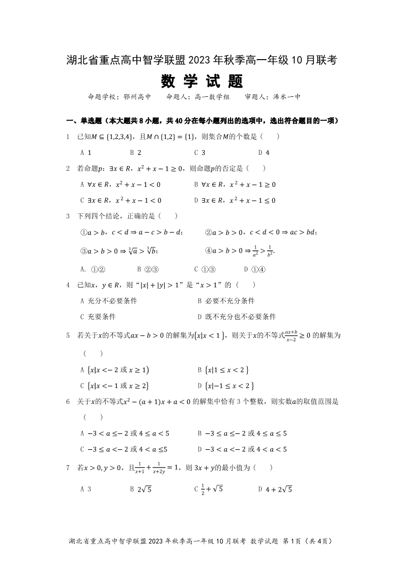 湖北省重点高中智学联盟2023年秋季高一年级10月联考数学